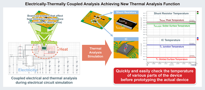 The newly added thermal analysis function can be implemented in solution circuits for devices and applications where heat is likely to become an issue in electronic circuit design. Examples are PTC heaters (heaters specifically designed for electric vehicles without internal combustion engines) equipped with IGBTs and shunt resistors as well as DC/DC converter ICs and LED drivers in order to meet the increasing demand to simulate temperature during circuit operation. This is the only simulator in the industry that enables web-based electrically and thermally coupled analysis of not only of the semiconductor chip (junction) temperature during operation, but also pin temperatures as well as thermal interference of board components on solutions circuits that include both power semiconductors and ICs along with passive components. As a result, thermal analysis that used to take as much as a day can now be performed in about ten minutes (100x faster than conventional methods). This allows users to quickly and easily check the temperature of various parts of the device before prototyping (instead of after as is currently the case), reducing the need for rework. At the same time, the amount of development resources required for applications where heat is an issue decrease.