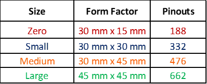 The all-new standard is available in 4 different sizes, ranging across Size Zero, Small, Medium and Large, varying on the LGA Contacts available on the module. The four different form factors can build upon each other.