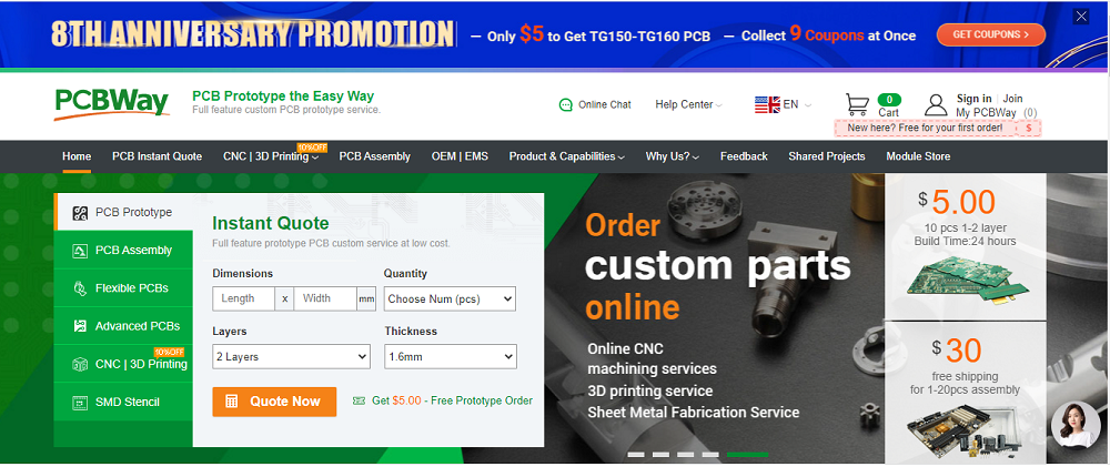 - Cost-effective: PCBWay gives cost-effective solutions to their customers as you can get access to direct order placement at their website. From time to time they also runs various discount offers. As right now they are running an offer to get TG150 and TG160 PCB and a lucky draw on their 8th Anniversary. They also offers special discounts for standard PCBs, which costs around only $5 for 10 PCBs, within 100x100mm. Along with it they also save the time and money as there is no middle-men and brokerage, as a result the cost of manufacture also declines.