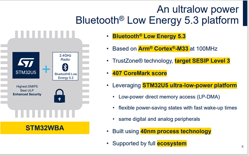 STM32WBA52 MCUs is wireless MCU targeted for IoT device developers. The MCU offers Bluetooth® LE 5.3 connectivity with advanced security in ultra-low power modes. STM32WBA offers a high data rate to ensure fast and reliable data transfer, Long-range capability to enlarge communication range, High output power to increase communication range thanks to internal PA with +10 dBm of output power and dynamically scalable power modes for Low-power messaging capability to extend battery life.