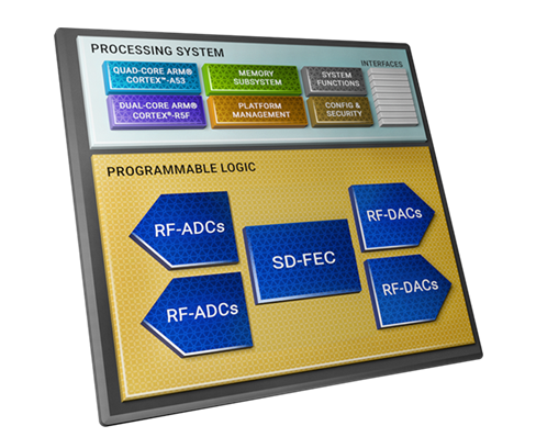 The RF data converters are laid out in tiles, each containing up to four RF-DACs or RF-ADCs. There are multiple tiles available in RFSoC, such that each tile also includes a block, clock handling logic, and distribution routing. This hierarchy of tiles and blocks simplifies the data converter design and implementation.