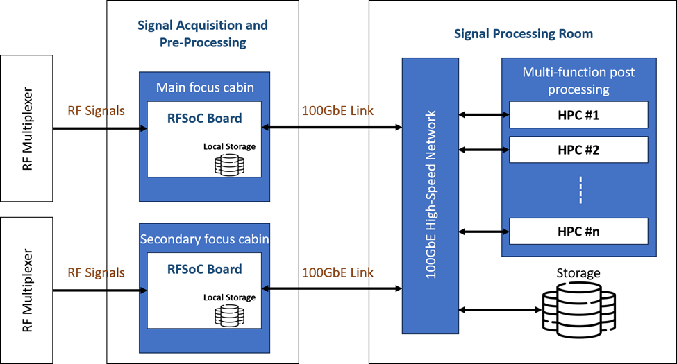 The signal acquisition and preprocessing unit utilize high-performance, low-power RFSoC technology with integrated high-speed 2.5 GSPS ADCs at 12-bit precision. RF multiplexers switch signals from various receivers, covering the entire passband with a maximum simultaneous bandwidth of 14 GHz. It also possesses local storage capabilities for retaining received signals, which can be transmitted to a post-processing unit when necessary for further processing.