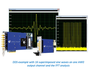 DDS-example with 16 superimposed sine waves on one AWG output channel and the FFT analysis DDS – Direct Digital Synthesis – is a method for generating arbitrary periodic sine waves from a single, fixed-frequency reference clock. It is a technique widely used in a variety of signal generation applications. The DDS functionality implemented on Spectrum Instrumentation’s AWGs is based on the principle of adding multiple ‘DDS cores’ to generate a multi-carrier (multi-tone) signal with each carrier having its own well-defined frequency, amplitude and phase.
