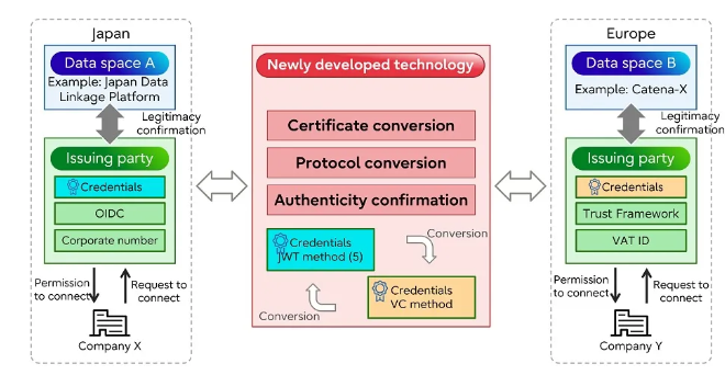 When a Japanese company connects to a data space using VCs, the technology converts authentication information into VCs if the company is certified as authentic by a corporate credential issuing organization for Japanese companies. The converted VC can be presented to the European data space to complete the company verification and to connect to the data space. Once connected, data providers and data consumers in the data space can exchange VCs and data after verifying each other’s authenticity.